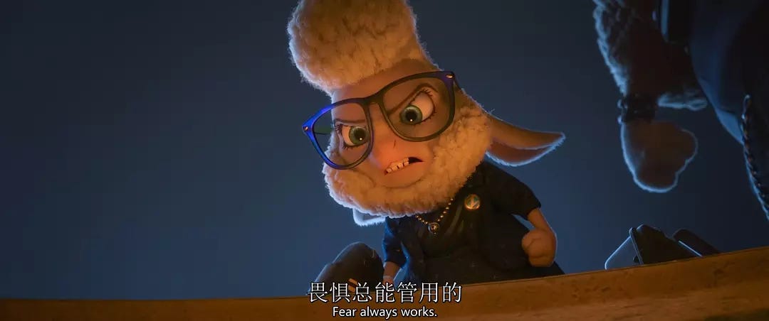 而随着电影展开,关于“午夜嚎叫”毒药的真相揭晓,观众开始明白食肉动物暴力行为的根源其实是当权者设下的结构性陷阱,而不是因为某个族群本性低劣。所以,《动物城1》讲的其实是个权力有意制造偏见、之后又利用偏见引发被统治者内斗的故事。“鹬蚌相争、渔翁得利”——就是在人为制造的危机和混乱之中,在不同群体忙于互相争斗的情况下,团结的希望被掐灭,以羊副市长为代表的「食草动物权力集团」得以坐收渔利并继续维持其统治。而且,在这个结构中,每个人都既是加害者又是受害者,没有人能够全身而退。例如朱迪对食肉动物存在偏见,但自己也因为体型小/女性身份而承受着“不能当警察”的偏见。可以说除了极少数当权者,所有人都可能成为这一体制的牺牲品。