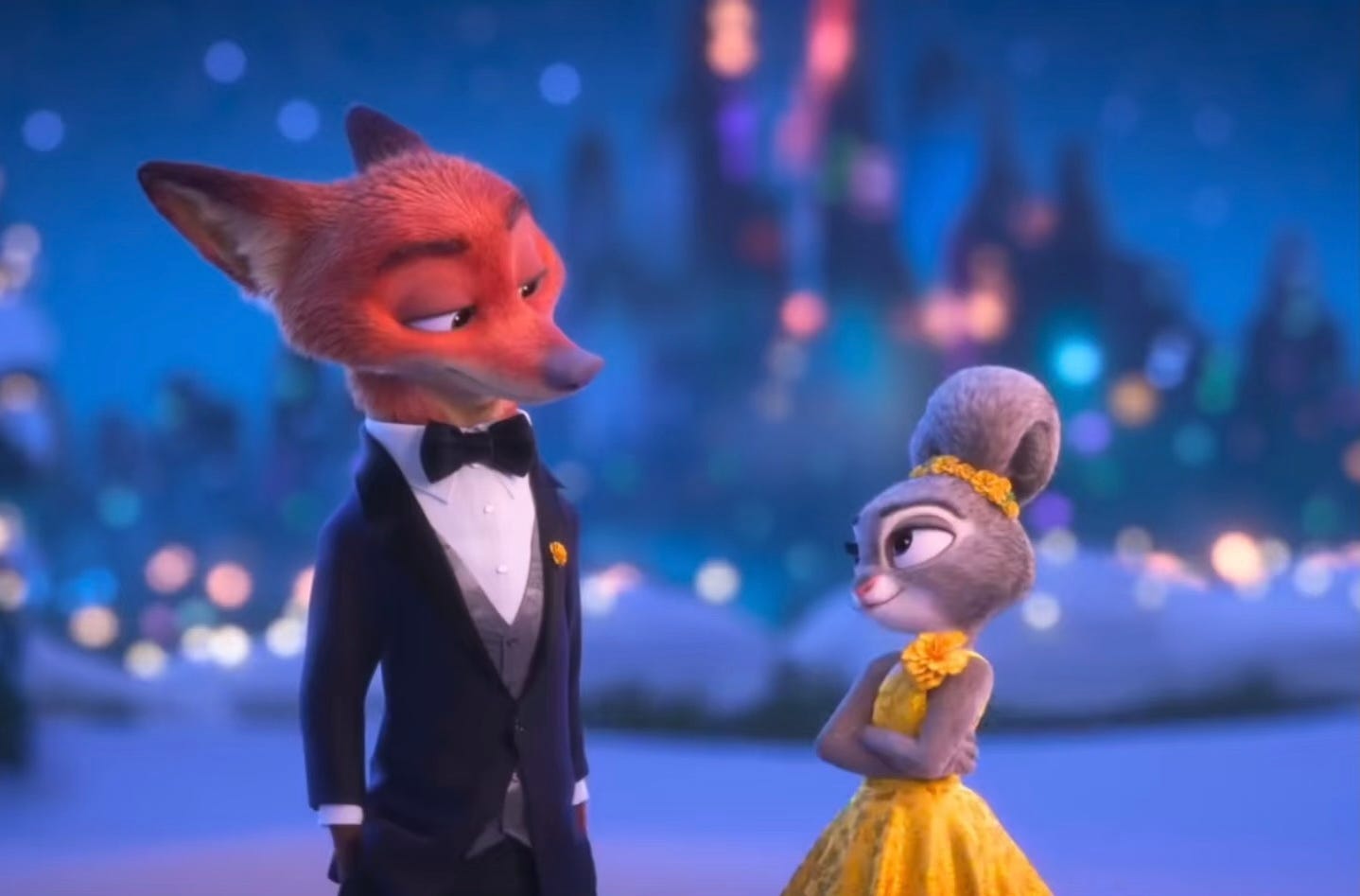 由于异性恋霸权和二元性别论本就是一体两面。所以《动物城2》要兜售异性浪漫爱,就必须要强化性别划分——这和戏外的世界如出一辙。最典型的还是晚宴那里狐狸穿西装、兔子着裙装。虽说是为了展示反派家族权势滔天,但我看到的却是对西方上层阶级文化、二元性别身份的恢复和强化。大家可以想一下如果这里的场景是睡衣party,那给人的感觉是完全不同的。